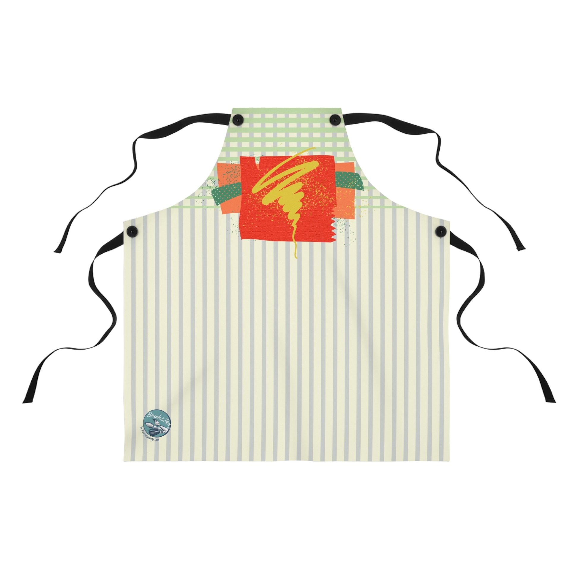 Bring a playful, artful energy into the kitchen with this durable printed apron. Lightweight polyester holds a crisp, painterly design—bright block colors and a spontaneous yellow swirl—against a soft striped background and subtle gingham yoke. The apron’s black detachable twill straps and four buttonholes let you adjust the fit or swap straps for a new look. Overlocked seams and quick-dry fabric mean it stands up to busy home-baking, messy studio sessions, and hands-on craft days. It wears like a creative companion: cheerful, practical, and built to last through many meals and projects.