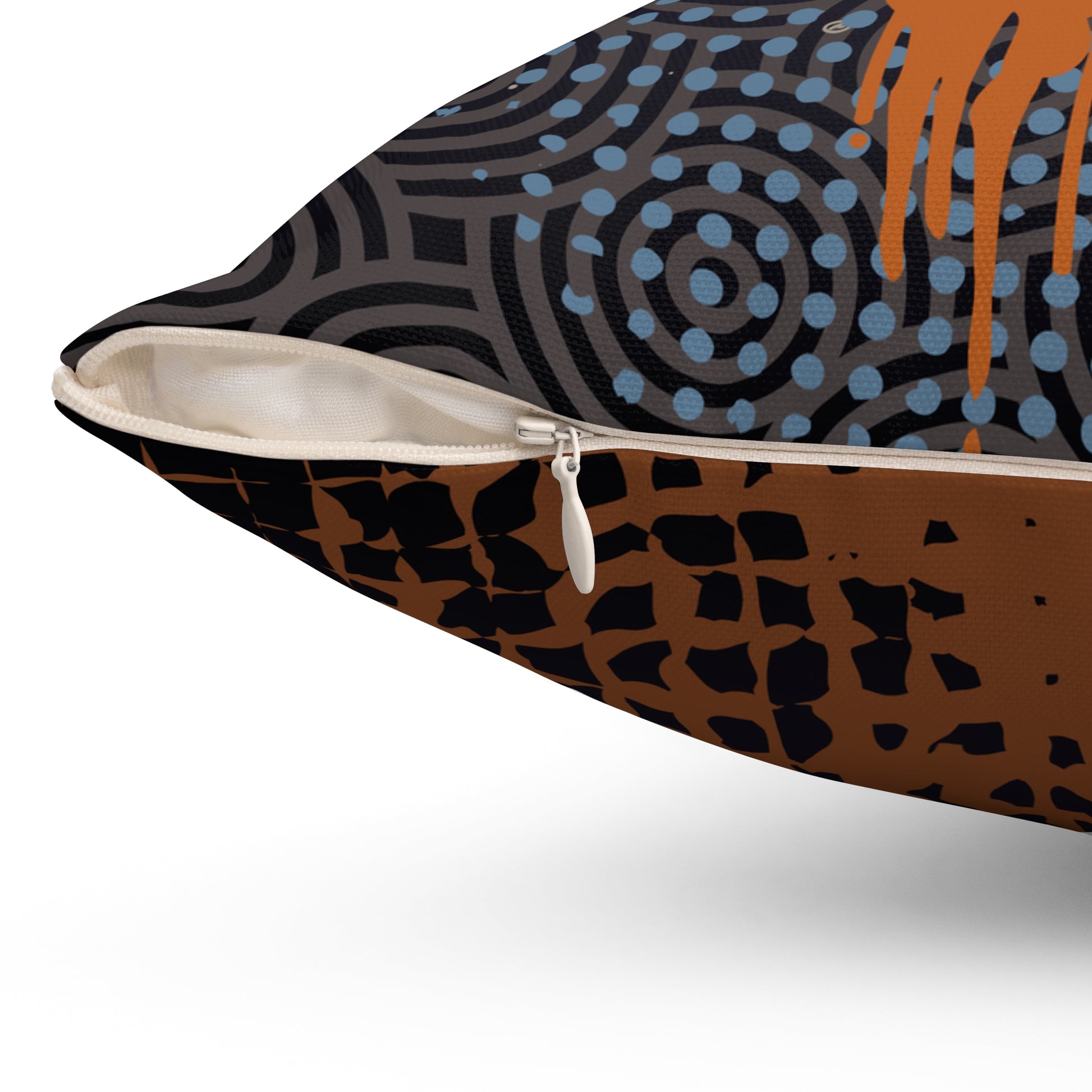 This square spun polyester pillow brings moody, urban-floral style to any cozy corner. A bold sunflower blooms across a textured, graffiti-inspired background — paint drips, circular patterns, and stenciled grids give it a street-art edge while warm ochres and deep charcoal keep the look grounded. The double-sided print means the design wraps the whole pillow, and the concealed zipper keeps the lines clean. It arrives with the cover and a recycled-poly insert shipped separately so the cover stays crease-free in transit. Tuck it into a reading nook, lean it against an industrial sofa, or layer it on a window seat to add a touch of handcrafted grit and soft warmth to everyday spaces.