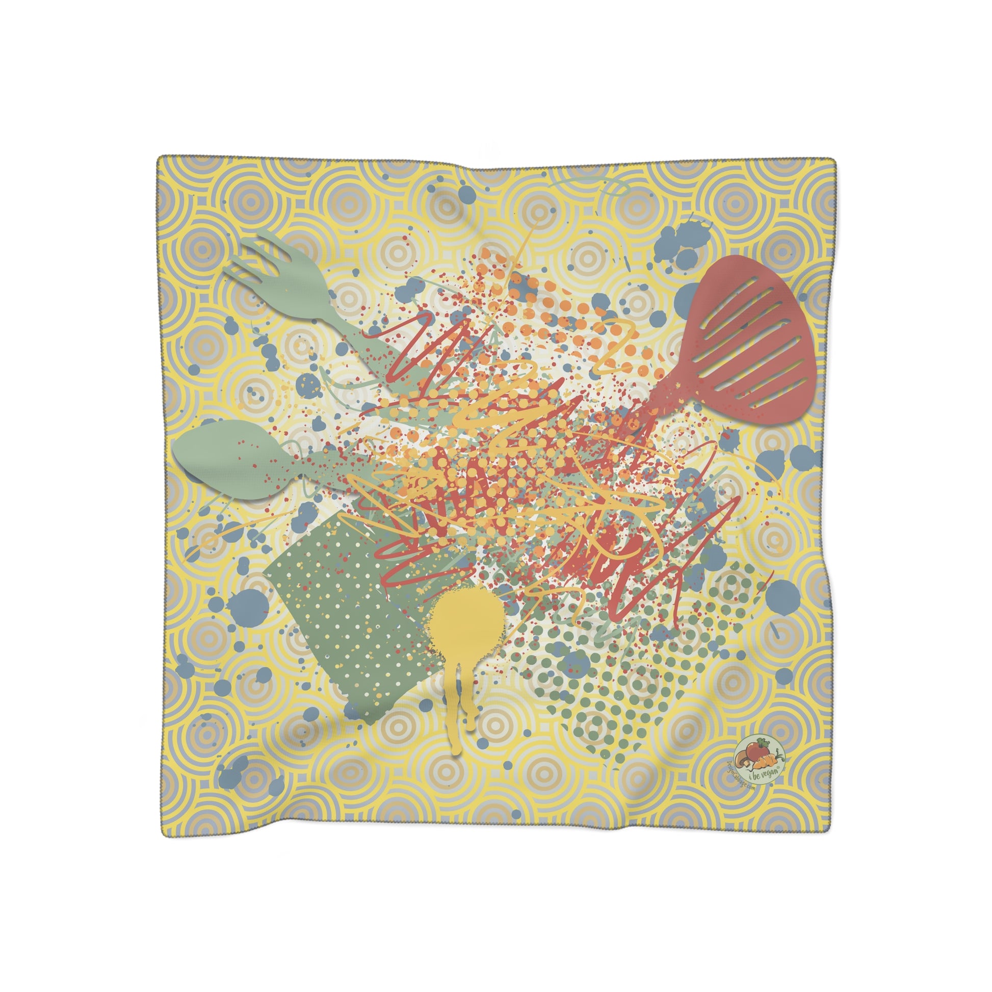 A lightweight polyester scarf that brings playful color and movement to everyday outfits. The scarf’s airy feel layers easily over tees, sweaters, or a light jacket without weighing you down. Bright, crisp printing highlights a modern, abstract kitchen-motif design—swirls, splatters, and utensil silhouettes in cheerful yellows, greens, and coral—so it reads like wearable art. Finished with neat black stitching, it keeps a tailored edge while still feeling casual and fun. Fold it into a neck wrap for daytime errands, drape it over shoulders during a cool evening, or tie it to a tote for an instant pop of personality.