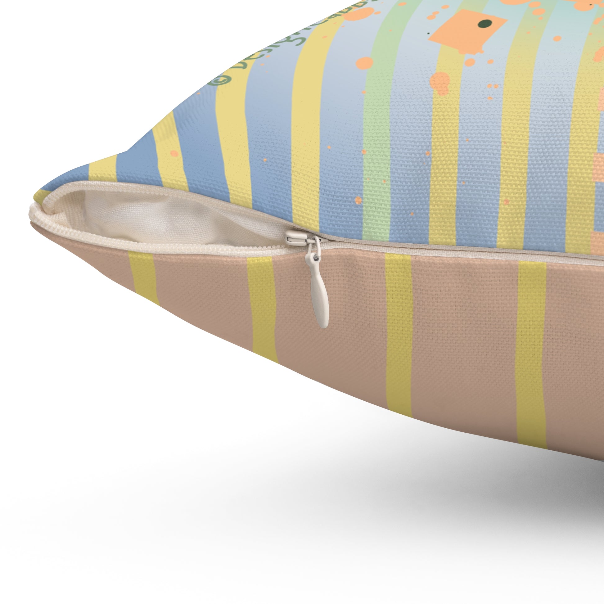 Bright, playful, and a little bit cheeky — this square pillow brings a burst of pop-art energy to any cozy corner. A bold strawberry illustration sits against layered paint splatters and soft stripes, creating a lively contrast that feels both retro and modern. The double-sided print keeps the look consistent from every angle, while the plush recycled-poly insert gives the cushion a full, pillowy shape once assembled. Tuck it on a couch, lean it against a reading chair, or layer it on a bed to add a splash of color and personality to everyday moments.
